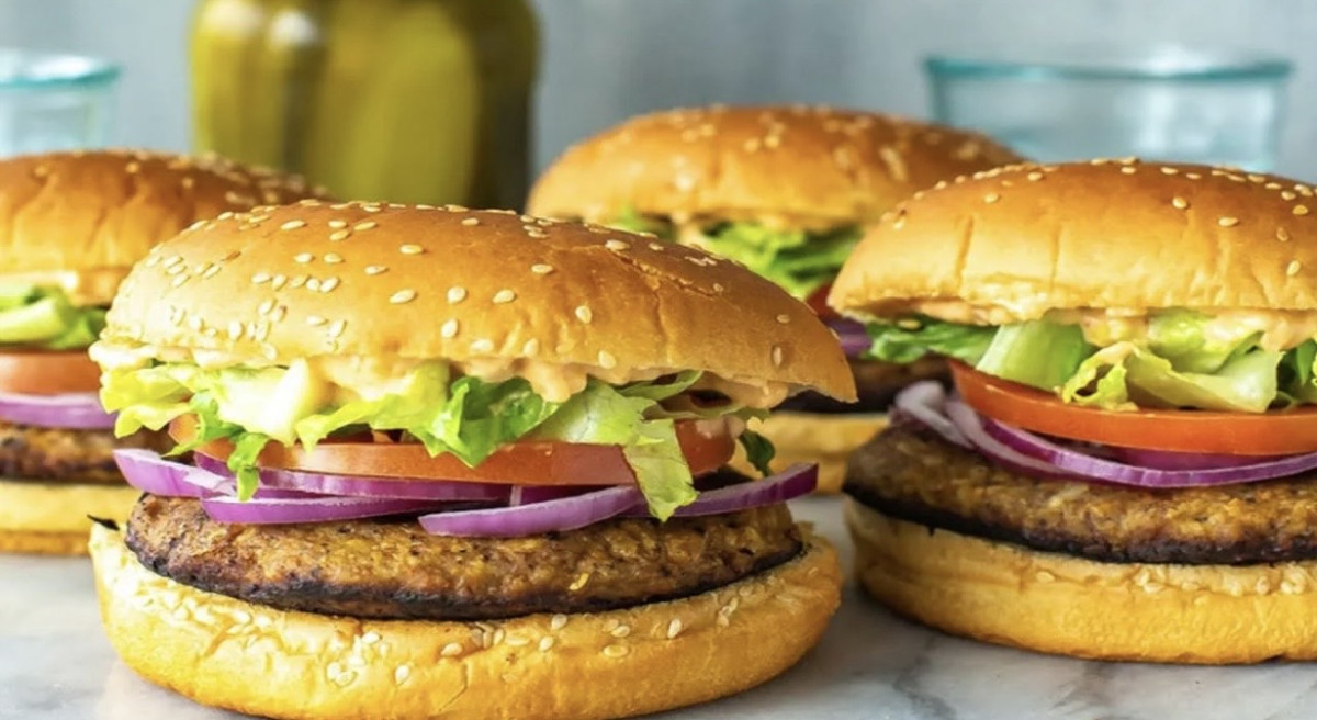 Булочка, фирменный соус, огурец, помидор, красный лук, лист салата, говяжья котлета